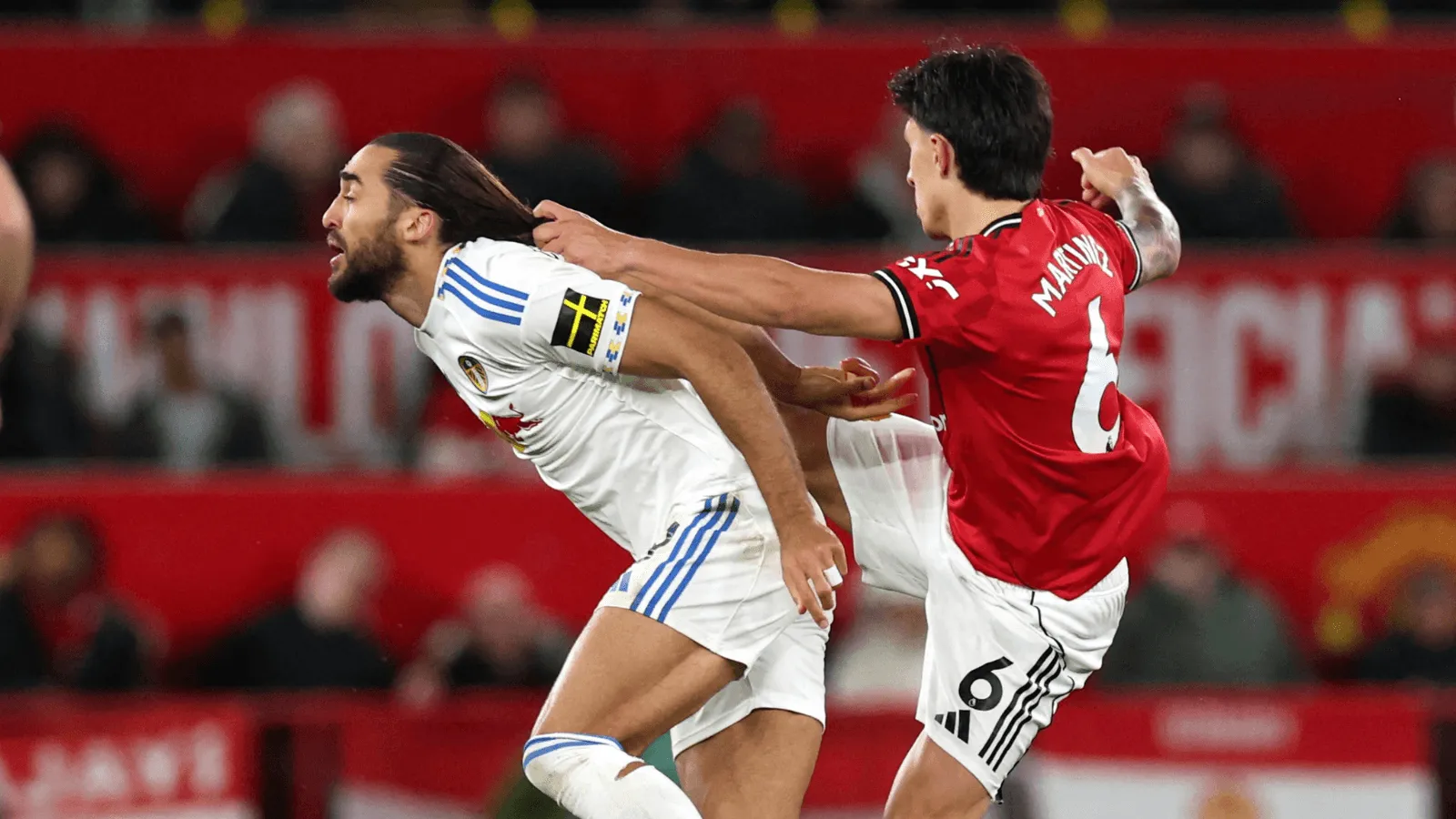 Com menos de 10 minutos do segundo tempo e o United já perdendo por 2 a 0, Martínez protagonizou um momento que será lembrado pela negatividade. Durante uma disputa de bola com Calvert-Lewin, o zagueiro puxou o rabo de cavalo do atacante do Leeds, gesto que passou despercebido inicialmente pelo árbitro Paul Tierney. O VAR, porém, recomendou a revisão imediata do lance.